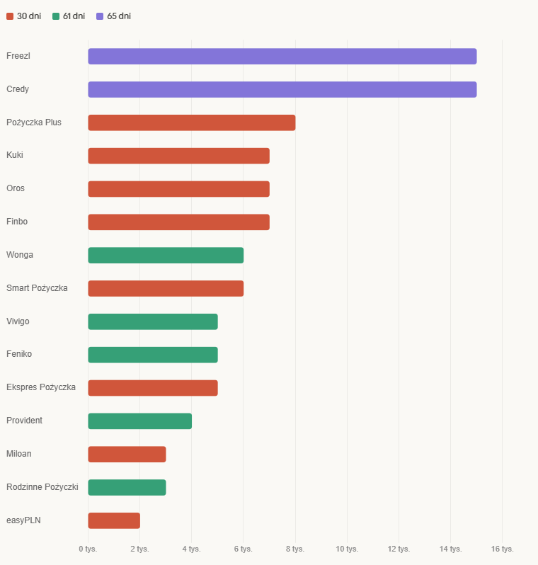 Reszta zestawienia to osiem firm z terminem 30 dni. Krócej, ale w kilku przypadkach z wyższymi limitami kwotowymi: Pożyczka Plus (szczegóły) do 8000 zł, Kuki (szczegóły) do 7000 zł, Oros (szczegóły) do 7000 zł, Finbo (szczegóły) do 7000 zł, Smart Pożyczka (szczegóły) do 6000 zł, Ekspres Pożyczka (szczegóły) do 5000 zł, Miloan (szczegóły) do 3000 zł i easyPLN (szczegóły) do 2000 zł.