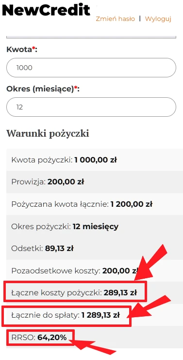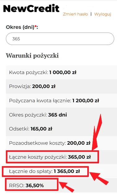 To też z przymrużeniem oka bo 12 miesięcy to przecież 365 dni i kiedy tak sobie zmieniam to okazuje się że w NewCredit niższe RRSO oznacza więcej do spłaty a niższe RRSO więcej. Trochę się wpatrywałem w wyliczenia i chciałem to tu pokazywać ale to bez sensu – to jest zbyt pomieszane ale zobaczcie te dwa zrzuty: