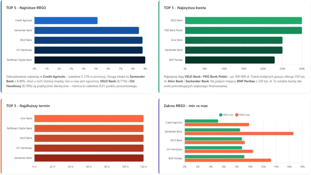 Najbardziej zbalansowaną ofertę ma VELO Bank – wysoka kwota (300K), długi termin (120 mies.) i niskie RRSO (8,77%). PKO BP przegrywa na terminie (tylko 24 mies.), a Credit Agricole na kwocie (50 tys.), choć wygrywa ceną.