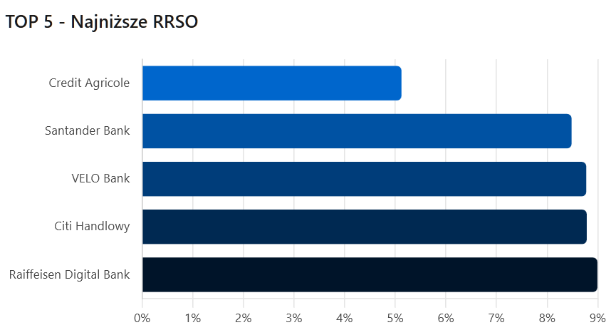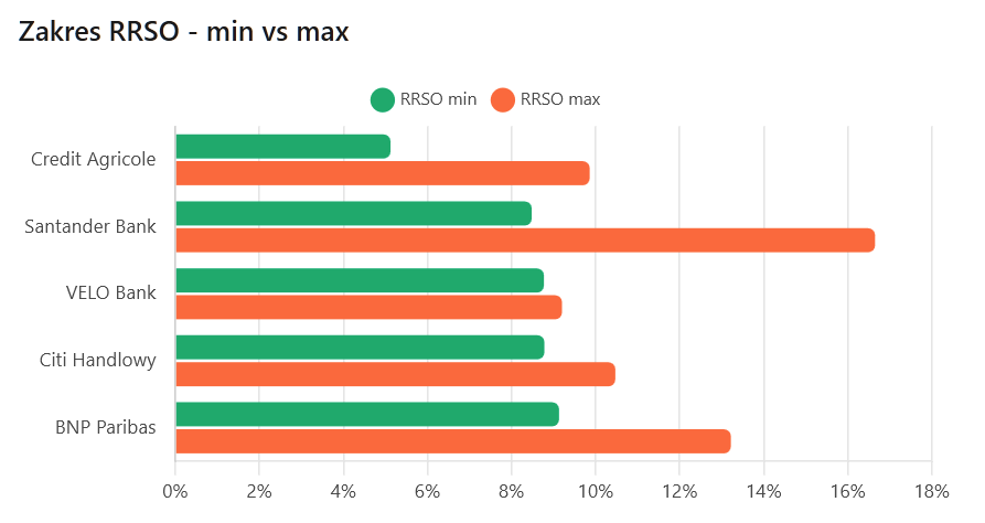 Największa rozpiętość to Santander Bank – od 8,48% do aż 16,65% (różnica 8,17 pp). Credit Agricole też mocno się rozjeżdża: 5,12→9,86%. BNP Paribas ma różnicę 4,09 pp. Najstabilniejsze warunki u VELO Bank (tylko 0,43 pp różnicy) i Citi Handlowy (1,69 pp).
