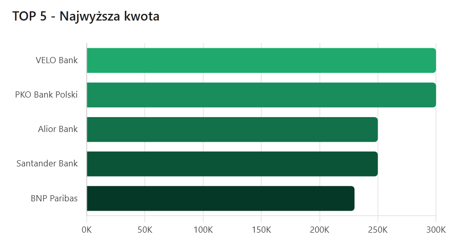 Najwięcej dają VELO Bank i PKO Bank Polski – po 300 000 zł. Trzech kolejnych graczy oferuje 250 tys. zł: Alior Bank i Santander Bank. Na piątym miejscu BNP Paribas z 230 tys. zł. To solidne kwoty dla osób potrzebujących większego finansowania.