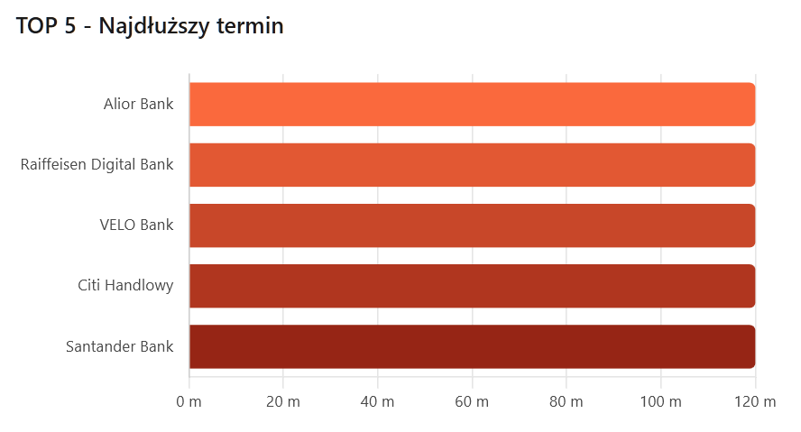 Aż siedem banków oferuje maksymalny okres 120 miesięcy (10 lat) – w TOP 5 są: VELO Bank, Citi Handlowy, Raiffeisen Digital Bank, Santander Bank i Alior Bank. To idealne rozwiązanie dla tych, którzy chcą mniejsze raty miesięczne. Najkrócej daje PKO Bank Polski -tylko 24 miesiące.